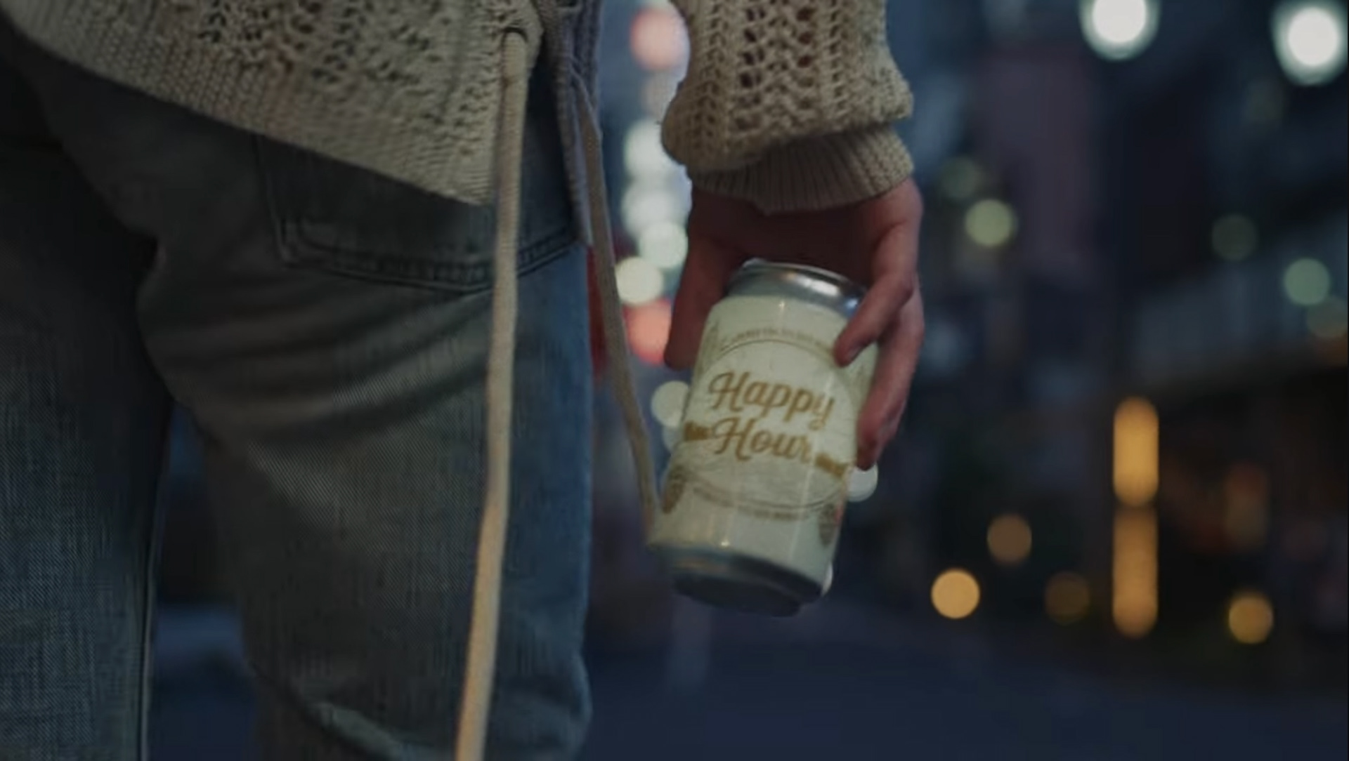 乾杯で光る缶を作りました。缶ラベルのデザインは中江監督によるものです。