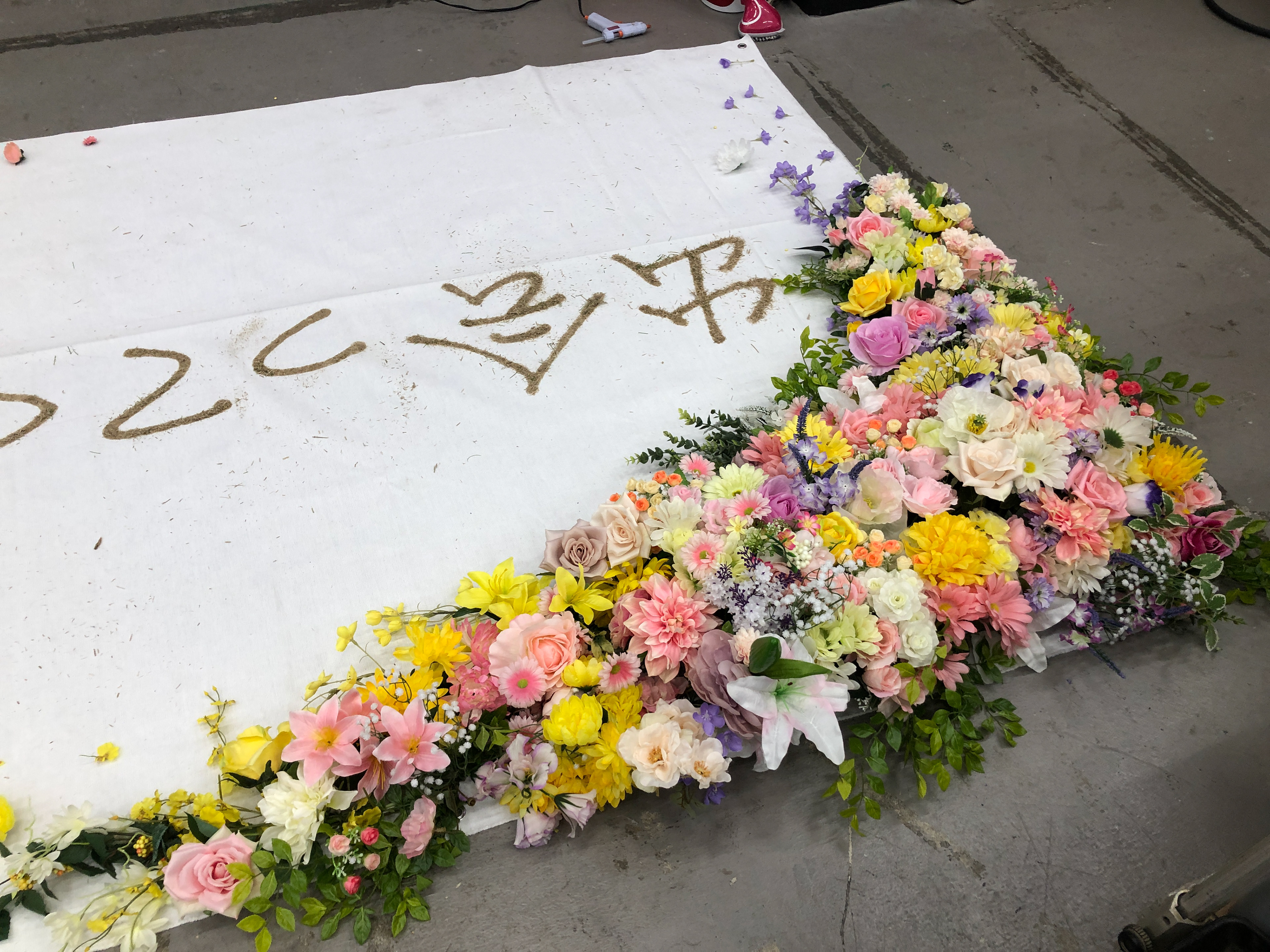 【小道具】数百本のお花を使い「 」のような形を作りました。 太陽企画の能勢さんと制作させていただきました。