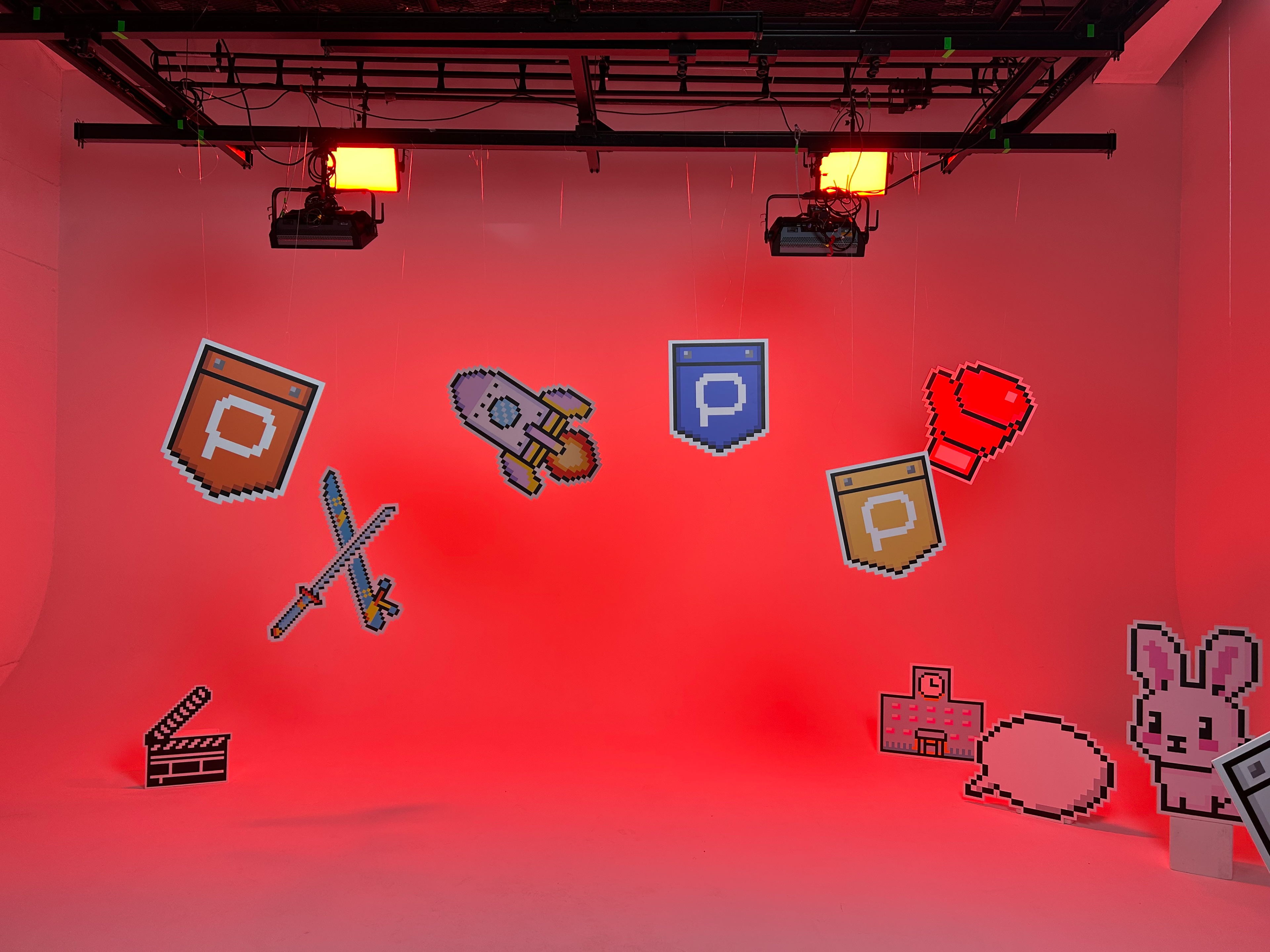 背景のドット絵スチレンボードパネルの大型UVプリンターによる出力と貼り込み、装飾をしました。アシスタント:岩永千聖